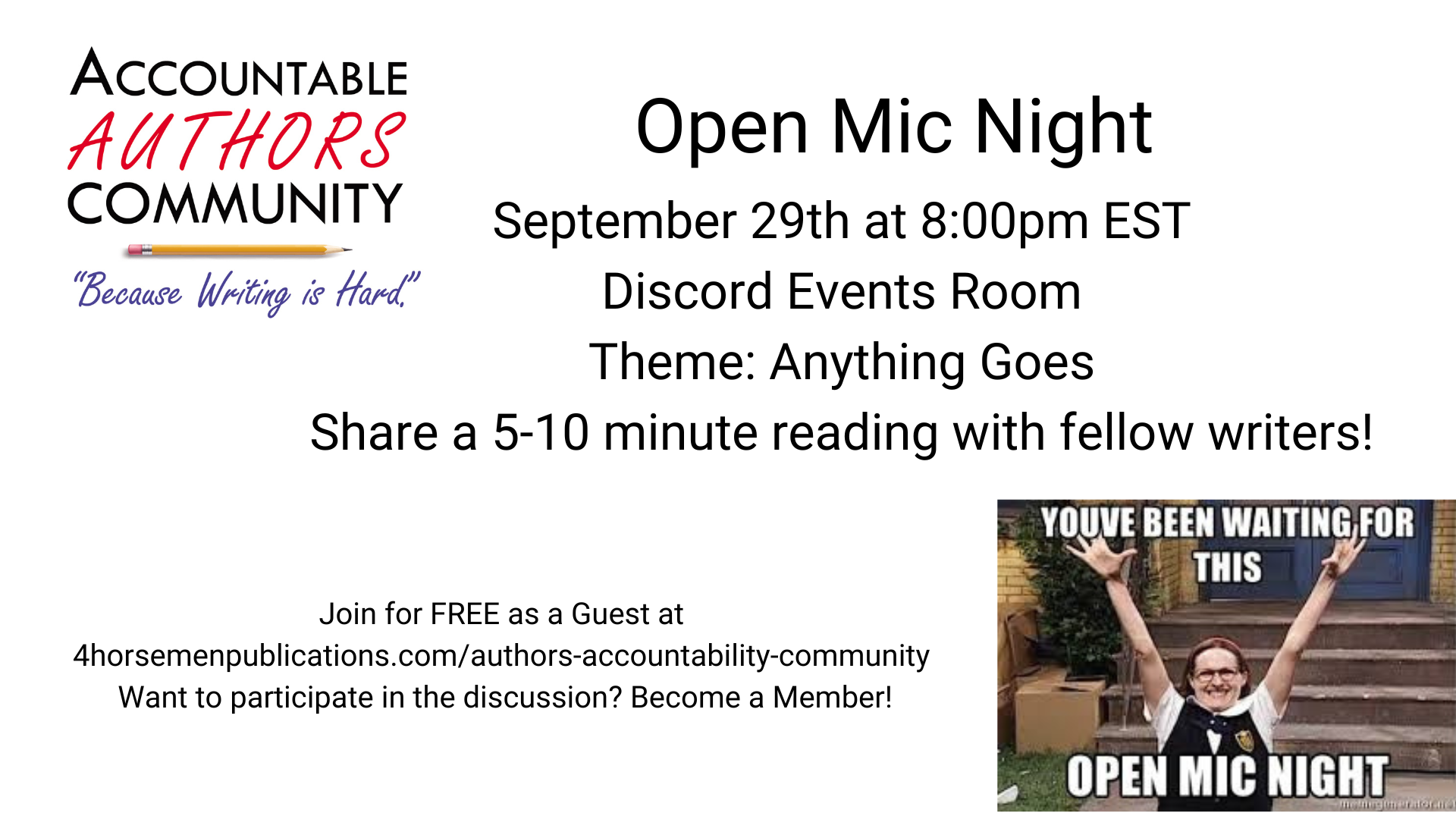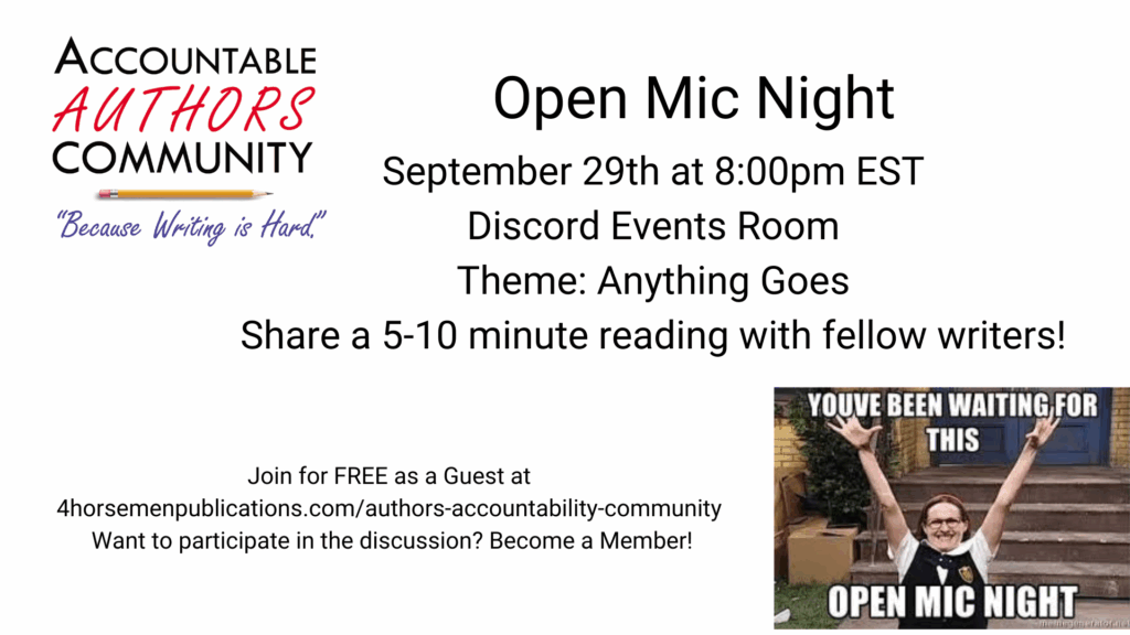 We’d like to invite you to join the 4HP Accountable Authors Group on Discord. There. You now have joined an author’s community filled with folks who are actively trying to stay accountable! Clicking below gives you access to the server where you can view the activities and channels.