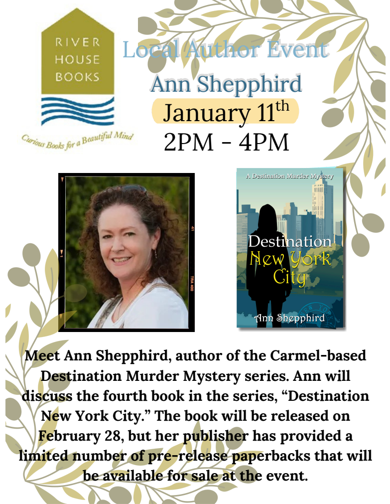 From 2-4 p.m. Ann Shepphird will be at River House Books in Carmel, California, discussing the fourth book in the Carmel-based Destination Murder Mystery series, Destination New York City. The book is scheduled for publication on February 28, but there will be pre-release copies available for purchase. Attending Author: Ann Shepphird